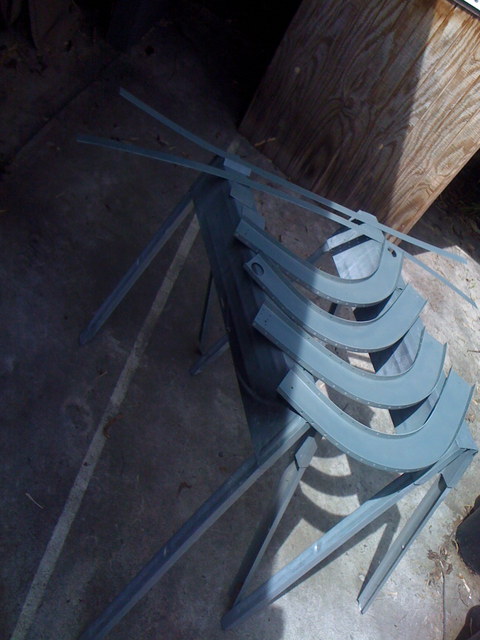 Here are the major parts, drying in the sun. For those of you in the cold crappy states like the one I’m from, it was 74 degrees F, sunny, and calm. Perfect paint weather. I’m not as anal about priming as I used to be, but since this stuff is pretty well inaccessible once it’s riveted together, a light coat of primer might help, especially since I live right near the coast, where the salty marine layer infiltrates everything.